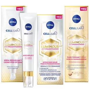 Nivea Cellular Luminous630 Zestaw kosmetyków do pielęgnacji twarzy 3 sztuki Seria kosmetyków LUMINOUS630® skutecznie hamuje produkcję melaniny oraz jest bezpieczna w codziennym stosowaniu dzięki precyzyjnemu działaniu. Każdy z produktów LUMINOUS630® koncentruje się na innym działaniu, dzięki czemu, stosując całą serię, przebarwienia są kompleksowo zredukowane a skóra jest promieniście rozjaśniona. Zestaw zawiera: NIVEA Cellular Luminous630® Krem redukujący cienie pod oczami 15 ml NIVEA Cellular Luminous630 Fluid tonujący na dzień przeciw przebarwieniom SPF20 40 ml NIVEA Cellular Luminous630® Intensywne serum przeciw przebarwieniom 30 ml NIVEA Cellular Luminous630® Krem redukujący cienie pod oczami Widocznie redukuje cienie pod oczami w 4 tygodnie Skutecznie redukuje 3 główne przyczyny powstawania cieni pod oczami Opatentowany LUMINOUS630® wyrównuje koloryt skóry i rozjaśnia cienie wokół oczu Energetyzująca kofeina zmniejsza opuchliznę wokół oczu redukując worki pod oczami Kwas Hialuronowy nawilża i pomaga redukować drobne linie i zmarszczki Postaw na krem na cienie pod oczami NIVEA Cellular Luminous630, który skutecznie redukuje 3 przyczyny cieni pod oczami, zmniejszając ich widoczność już w 4 tygodnie. Krem redukujący cienie pod oczami przy regularnym stosowaniu zapewnia rozświetloną i młodo wyglądającą skórę wokół oczu.