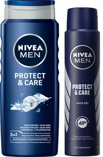 NIVEA MEN PROTECT & CARE Zestaw zawiera : NIVEA PROTECT & CARE ŻEL POD PRYSZNIC 500ml NIVEA PROTECT & CARE ANTYPERSPIRANT SPRAY 250ML PROTECT & CARE ŻEL POD PRYSZNIC NIVEA Men Żel pod prysznic Original Care dla mężczyzn zawiera pielęgnującą formułę z aloesem, która pomaga chronić skórę przed wysuszeniem. Żel ma przyjemny, męski zapach i zapewnia skórze uczucie intensywnego nawilżenia i zdrowy wygląd. Produkt ten można stosować do mycia ciała, twarzy oraz włosów. Nie podrażnia skóry, a delikatnie ją pielęgnuje, zapobiegając przesuszaniu.