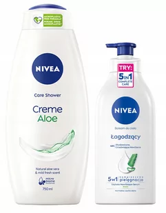 Nivea zestaw z Aloesem Zestaw zawiera: 1x KREMOWY ŻEL POD PRYSZNIC CREME ALOE 750 ML 1x ŁAGODZĄCY BALSAM DO CIAŁA KREMOWY ŻEL POD PRYSZNIC CREME ALOE 750 ML Odkryj, jak pielęgnująca moc żelu z dodatkiem naturalnego aloesu dba o piękny wygląd Twojej skóry, jednocześnie zachowując równowagę jej mikrobiomu. Poczuj, jak delikatna piana otula Twoje ciało i oczyszcza Twoją skórę, która pozostanie miękka i gładka w dotyku. Delikatny zapach aloesu rozpieści Twoje zmysły działając odświeżająco i doda Ci energii. Spraw by codzienny prysznic zamienił się w chwilę wytchnienia i relaksu.