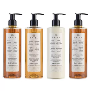 Zestaw kosmetyków PRIJA to hypoalergiczne produkty o delikatnym intrygującym i zmysłowym zapachu. Dzięki zastosowaniu wyciągów roślinnych posiadają właściwości regeneracyjne, odżywcze i aromaterapeutyczne. Ciepłe zapachy, naturalne kolory, zmysłowa konsystencja sprawią, że Twoja pielęgnacja będzie chwilą relaksu na najwyższym poziomie. Całkowicie wegańska formuła nada się dla każdego, a miłośnicy natury będą zadowoleni dzięki temu, że butelka oraz etykieta zostały wykonane z produktów z recyklingu. Zestaw składa się 1x380 ml regenerującego szamponu do włosów z rukolą, 1x380 ml mydła w płynie, 1x380 ml kremu nawilżającego oraz 1x380 ml żelu pod prysznic żeń-szeń.
