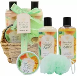 Aurora Zestaw Prezentowy 4 Kosmetyków w Wiklinowym Koszyku Mango Gruszka Zestaw Prezentowy Aurora - Gruszka i Mango (4 Elementy) to doskonały prezent dla osób, które pragną cieszyć się relaksującym i owocowym doznaniem podczas codziennej pielęgnacji ciała. Żel Pod Prysznic (250 ml): Żel pod prysznic o zapachu soczystej gruszki i mango to prawdziwa uczta dla zmysłów. Delikatna, ale bogata formuła myjąca sprawia, że każda kąpiel lub prysznic stają się aromatycznym rytuałem. Ten żel doskonale oczyszcza skórę, jednocześnie pozostawiając ją nawilżoną i pięknie pachnącą.