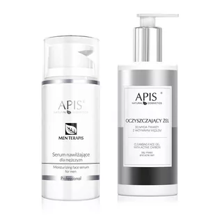 Zestaw męskich kosmetyków Apis Professional do oczyszczenia i nawilżenia skóry twarzy: Oczyszczający żel do mycia twarzy z aktywnym węglem Apis Detox i Serum nawilżające dla mężczyzn Apis Men Terapis.