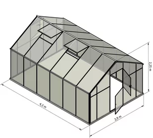 Duża szklarnia ogrodowa Sanus XL-12 wymiar 2,9x4,3m, wysokość 2,25m, powierzchnia 12,5m2, konstrukcja została wykonana z wytrzymałych profili aluminiowych natomiast wypełnienie stanowi poliwęglan komorowy o grubości 6mm.