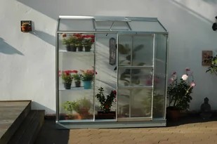 Szklarnia aluminiowa do ściany, sz 1,93 x gł 0,69 m, kolor srebrny, 1x okno dachowe, poliwęglan o grubości 4 mm z Wielkiej Brytanii, pow 1,33 m2.