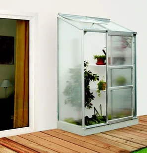Szklarnia aluminiowa do ściany, sz 1,31 x gł 0,69 m, kolor srebrny, 1x okno dachowe, poliwęglan o grubości 4 mm z Wielkiej Brytani, pow 0,9 m2.