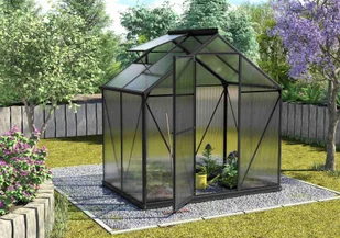 Szklarnia ogrodowa aluminiowa, sz 1,98 x gł 1,31 m, czarna, 1x okno dachowe, poliwęglan o grubości 6 mm z Wielkiej Brytanii, drzwi uchylne, pow 2,59 m2.