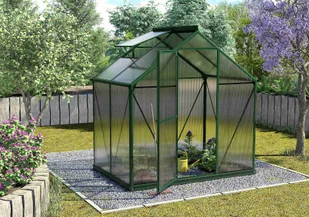 Szklarnia aluminiowa, sz 1,98 x gł 1,31 m, kolor zielony, 1x okno dachowe, poliwęglan o grubości 6 mm z Wielkiej Brytanii, drzwi uchylne, pow 2,59 m2.