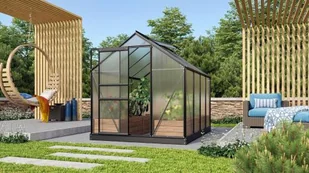 Szklarnia aluminiowa, sz 1,95 x gł 2,57 m, kolor czarny, 1x okno dachowe, poliwęglan o grubości 6 mm z Wielkiej Brytanii, pow 5,01 m2.