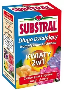 Kwiaty 2w1, marki SUBSTRAL. rodek przeznaczony do ochrony rolin przed chorobami oraz insektami. Preparat działa systemicznie i może być użyty do ochrony rolin jak i do interwencyjnego pozbywania się szkodników. Szczególnie skuteczny jest w walce z chorobami grzybowymi i mszycami. Zalecany jest do użycia w uprawach ozdobnych - kwiaty, krzewy.