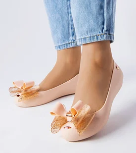 Balerinki Jeromewsuwane, na płaskiej podeszwie z niewielkim podwyższeniem. Z niską cholewką udekorowaną drobnym nitem przy kostce. Na okrągłym nosku znajduje się obszerna kokarda. Wsuwane, wykonane z gumy. Ten model balerinek jest w trendach już od kilku lat - i nie zapowiada się na to, żeby wyszedł z mody! Numeracja standardowa, sugerujemy kierować się swoim rozmiaerem.