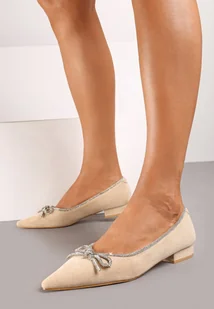 Beżowe Balerinki na Płaskiej Podeszwie z Kokardą i Cyrkoniami Evalyra