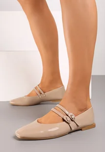 Beżowe Lakierowane Płaskie Balerinki Ozdobione Kwadratowym Noskiem i Paskami Mailine
