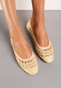 Beżowe Płaskie Balerinki z Imitacji Skóry o Ażurowym Wykończeniu Yines