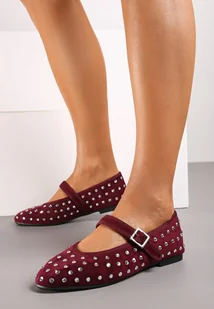 Bordowe Balerinki z Imitacji Zamszu z Paseczkiem i Klamerką Zdobione Cyrkoniami Daibelle