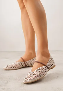Jasnobeżowe Balerinki Mary Jane z Ażurową Cholewką Imitującą Plecionkę Timina