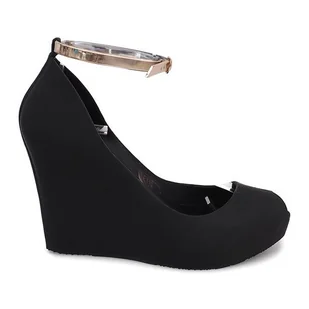 Tabela rozmiarów. . Meliski na koturnie są modnymi butami o unikatowym wzorze. Wykonane są one z gumy, która posiada bardzo wysokie cechy jakościowe. Dzięki miękkiemu materiałowi buty te są bardzo wygodne do noszenia. Wyprodukowane są w uniwersalnym czarnym kolorze, co dodaje im charakteru.
