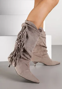 Beżowe Botki na Obcasie Typu Kaczuszka z Marszczeniem i Frędzlami Latireia