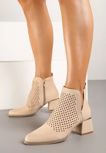 Beżowe Botki Vices z Ekozamszu z Ozdobnymi Wycięciami na Słupku z Metalicznym Detalem Naetha