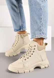 Beżowe Traperki na Tłoczonej Podeszwie z Futrzaną Wyściółką Leathriel