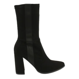 Botki damskie zamszowe Big Star GG274397 czarne. Efektownie się prezentujące, klasyczne i eleganckie w jednym - takie właśnie dłuższe botki damskie znaleźć powinny się w szafie każdej modnej kobiety, uwielbiającej stylizacje z klasą i smakiem. Szykowne dłuższe botki to precyzyjne wykonanie ze skóry ekologicznej zamszowej, w kolorze czernym. Obuwie doskonale prezentuje się w duecie ze stylizacją każdego typu - zarówno wizytową, jak i codzienną. Obcas 9 cm i ciekawa, klasyczna dłuższa 25,5 cm cholewka z suwakiem, pozwala na zachowanie modnych i stylowych rozwiązań.
