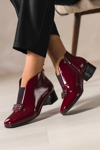 Bordowe botki skórzane damskie lakierowane obcas klocek elastyczna guma na przodzie srebrna ozdoba PRODUKT POLSKI Casu 378-L