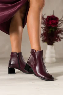 Bordowe botki skórzane damskie na ozdobnym klocku na cholewce pasek z ozdobą PRODUKT POLSKI Casu 39436