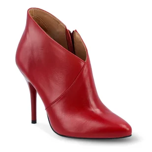 Licowebotki damskiewykonane z naturalnej skóry. Buty są wżywym, czerwonymkolorze. Zasuwane z boku na praktyczny zamek. Posiadają wysoki, cienki obcas oraz czubek uformowany w kształt lekkiego szpica. Botkimają u góry asymetryczne wycięcie, na którym widać delikatny szew.