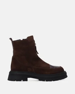 Brązowe botki damskie wykonane z naturalnego zamszu to połączenie stylu i funkcjonalności. Z przodu znajdują się ozdobny suwak, który dodaje charakteru, oraz praktyczne zapięcie na suwak z boku, ułatwiające zakładanie i zdejmowanie obuwia. Na nosku zastosowano efektowną wstawkę z lakierowanej skóry, która subtelnie kontrastuje z matową strukturą zamszu i dodaje całości nowoczesnego wyglądu. Gruba podeszwa z wyraźnym bieżnikiem to nie tylko modny akcent, ale też gwarancja stabilności i przyczepności na różnych nawierzchniach. Dzięki miękkiej cholewce i solidnemu wykonaniu botki zapewniają komfo