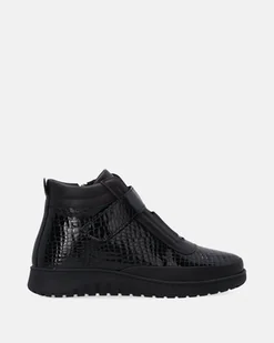 Botki damskie wykonane z naturalnej skóry o tłoczonej strukturze i lakierowanym wykończeniu, w czarnym kolorze. Połyskująca faktura podkreśla elegancki, nowoczesny charakter modelu. Zapięcie na szeroki rzep oraz suwak po wewnętrznej stronie cholewki zapewniają wygodne zakładanie i idealne dopasowanie do stopy. Zaokrąglone noski, przeszywany otok oraz podwyższona, elastyczna podeszwa gwarantują komfort w codziennym użytkowaniu. Wnętrze ocieplone miękką futrówką i wkładką z materiału zapewnia przyjemne ciepło i wygodę podczas noszenia.