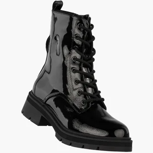 modne botki damskie ocieplane w miejskim stylu Materiał zewnętrzny: połyskująca lakierowana ekoskóra, odporna na wilgoć Wnętrze: przyjemne, miękkie futerko gwarantujące ciepło w chłodne dni Podeszwa: masywna, antypoślizgowa, dodająca wysokości i stabilności Zapięcie: praktyczny suwak z boku oraz sznurowanie dla idealnego dopasowania Kolor: