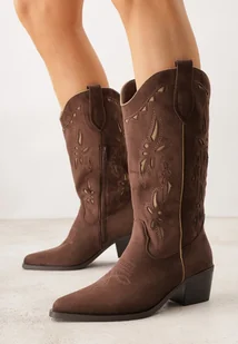Brązowe Ażurowe Botki Kowbojki na Stożku z Imitacji Zamszu Hephiane