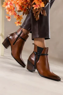 Brązowe botki skórzane damskie kowbojki na ściętym klocku guma w cholewce pasek ze stalową ozdobą PRODUKT POLSKI Casu 39435