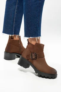 Brązowe botki skórzane damskie Sergio Leone na bieżnikowanym klocku ozdobny pasek z klamrą BT720-S-CA