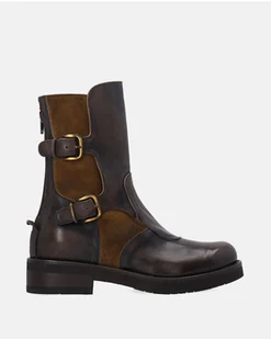 Botki damskie wykonane z naturalnej skóry w brązowym kolorze z subtelnym cieniowaniem. Połączenie skóry licowej z zamszowymi wstawkami tworzy elegancką i wyrazistą kompozycję. Model zdobią dwie ozdobne klamry umieszczone po zewnętrznej stronie cholewki w kolorze starego złota, które podkreślają charakter butów i umożliwiają delikatną regulację szerokości. Z tyłu znajduje się praktyczny suwak ułatwiający zakładanie. Stabilna podeszwa i przeszywany otok dodają całości solidności, a wnętrze wykończone skórzaną wkładką i futrówką zapewnia wysoki komfort noszenia.
