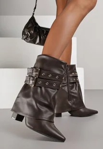 Brązowe Botki Typu Kowbojki na Obcasie z Wywiniętą Cholewką i Klamrami Cidvire