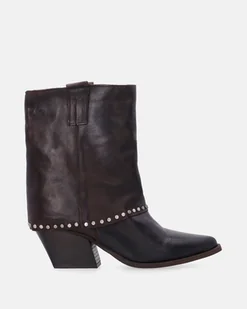 Botki damskie w ciemnym odcieniu brązu wykonane z miękkiej, naturalnej skóry. Wywinięta, luźno układająca się cholewka podkreślona jest ozdobnym pasem z równym rzędem metalowych nitów, które dodają całości wyrazistego charakteru. Prosta górna krawędź z szlufką ułatwia zakładanie, a szeroki, stabilny obcas typu klocek nadaje botkom masywnego, nowoczesnego wyglądu. Całość utrzymana jest w kowbojskim klimacie, który świetnie sprawdzi się do jesiennych stylizacji. skóra naturalna wywinięta cholewka ozdobne nity stabilny obcas typu klocek szpiczaste noski wsuwany fason usztywniane noski i zapiętki