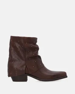 Botki wykonane z miękkiej, czarnej skóry naturalnej z ozdobnymi nitami. Marszczona, swobodnie układająca się cholewka nadaje modelowi lekkości i nowoczesnego charakteru. Niski, stabilny obcas zapewnia komfort noszenia każdego dnia. wywinięta cholewka ozdobne nity na cholewce niski, stabilny obcas szpiczasty nosek wsuwany fason