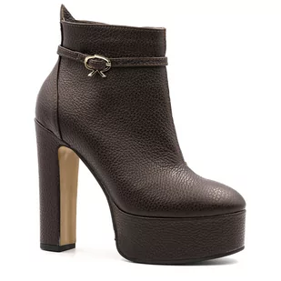 Eleganckie botki na 13 cm stabilnym obcasie i 4 cm platformie wyprodukowano z naturalnej skóry licowej z widocznym uziarnieniem. Od wewnętrznej strony cholewki wszyto suwak. Cholewkę przybrano cienkim paskiem z delikatną złotą ozdobą. Podszewkę i wkładkę wykonano z ciepłego materiału. Orientacyjne wymiary dla rozmiaru 37 to: