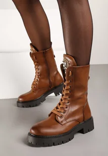 Brązowe Sznurowane Botki Workery na Płaskiej Podeszwie Ozdobione Cyrkoniami Esamarae