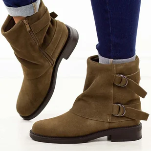 to idealny wybór na chłodną jesień oraz zimę, łączący wygodę i ponadczasowy styl. Cholewka wykonana jest z wysokiej jakości skóry naturalnej zamszowej, dzięki czemu obuwie prezentuje się elegancko i modnie. W bocznej części umieszczono dwie ozdobne klamerki, które dodają całości wyjątkowego charakteru. Model jest zapinany na suwak, co ułatwia zakładanie i zdejmowanie butów. Okrągły nosek zapewnia komfort noszenia, a wnętrze ocieplone miękkim polarem chroni stopy przed chłodem w zimniejsze dni.