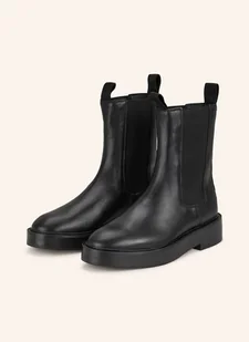 Gładka skóra. Pętelki ułatwiające zakładanie przy cholewce. Boczne wstawki ze stretchu. Migdałowe noski. Podeszwa zewnętrzna owyglądzie drewna warstwowego. Obcas słupek o wyglądzie drewna warstwowego. Logo z boku