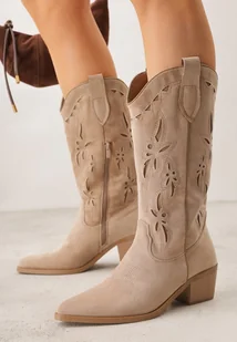 Ciemnobeżowe Ażurowe Botki Kowbojki na Stożku z Imitacji Zamszu Hephiane
