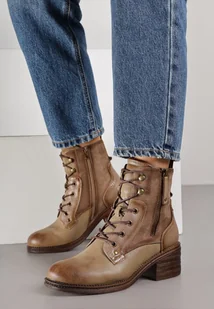 Ciemnobeżowe Botki Trzewiki na Klockowym Obcasie Zdobione Suwakiem Salittea