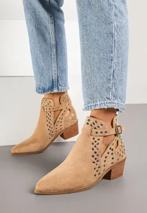 Ciemnobeżowe Botki Vices na Słupku w Stylu Kowbojek z Metalicznymi Aplikacjami i Wycięciami Virori
