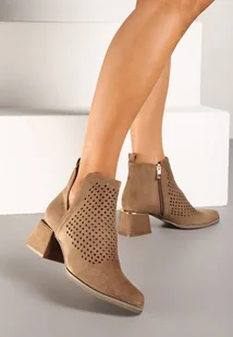 Ciemnobeżowe Botki Vices z Ekozamszu z Ozdobnymi Wycięciami na Słupku z Metalicznym Detalem Naetha