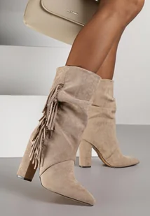 Ciemnobeżowe Botki w Stylu Kowbojek na Obcasie Ozdobione Frędzlami Reitania