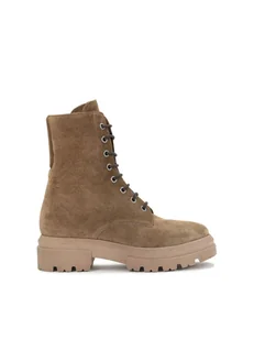 <p>Ciemnobeżowe <strong>trzewiki damskie</strong> z prostą cholewką i grubą podeszwą wykonane są z wysokiej jakości <strong>zamszu</strong> o przyjemnej w dotyku fakturze. Z wyglądu przypominają masywne militarne obuwie, które doskonale sprawdza się w różnych warunkach. Minimalistyczny design, uniwersalna kolorystyka oraz oszczędność w zdobieniach to wyznaczniki dobrego stylu. </p> <ul> <li>Wyściółka z semianilinowej skóry koźl