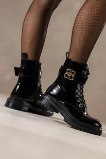 Czarne botki damskie lakierowane na bieżnikowanej platformie złota ozdoba sznurowane Casu HF234