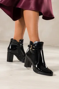 Czarne botki damskie lakierowane Sergio Leone na słupku ozdobny pasek ze złotą klamrą YG675