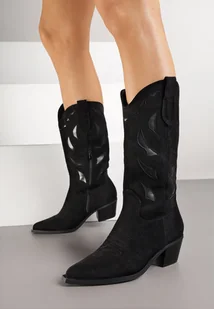 Czarne Botki Kowbojki na Stożkowym Obcasie z Geometrycznym Wzorem Lativia